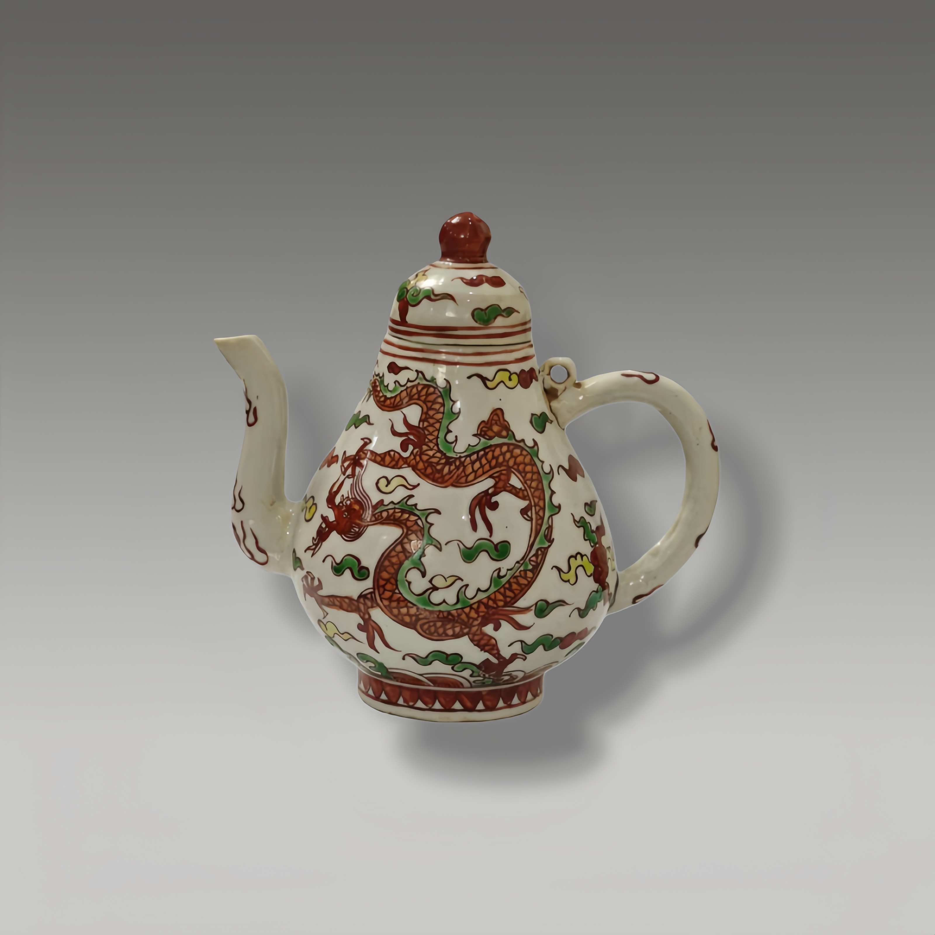 器型取经典梨式,线条婉转流畅,轮廓端庄大气。龙纹绘饰笔触遒劲,龙身矫健灵动,鳞爪分明尽显神威