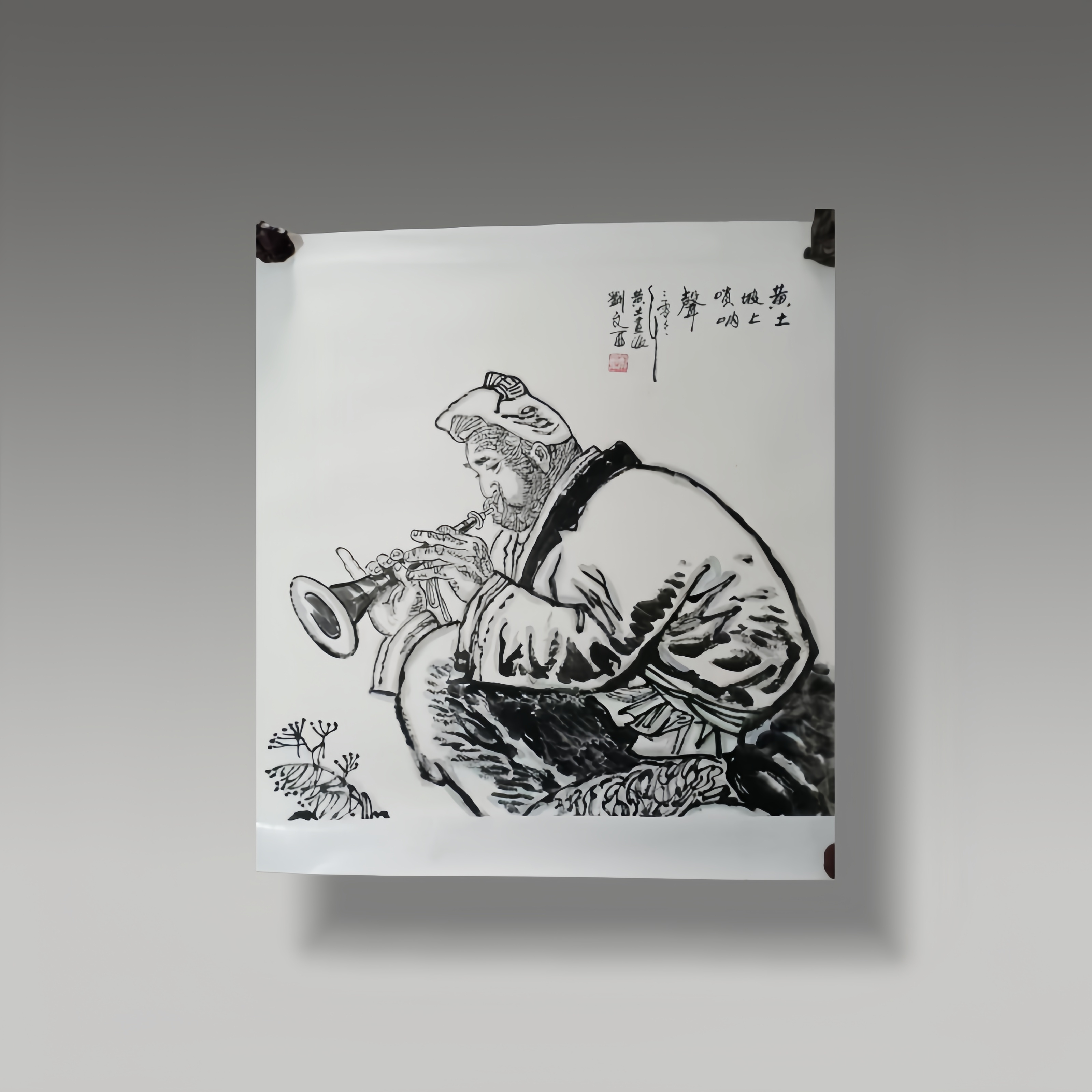 以黑白笔墨绘以洗练苍劲的笔墨,就陕北高原的民间瞬间,人物神态专注,线条苍劲质朴,气韵沉雄朴厚
