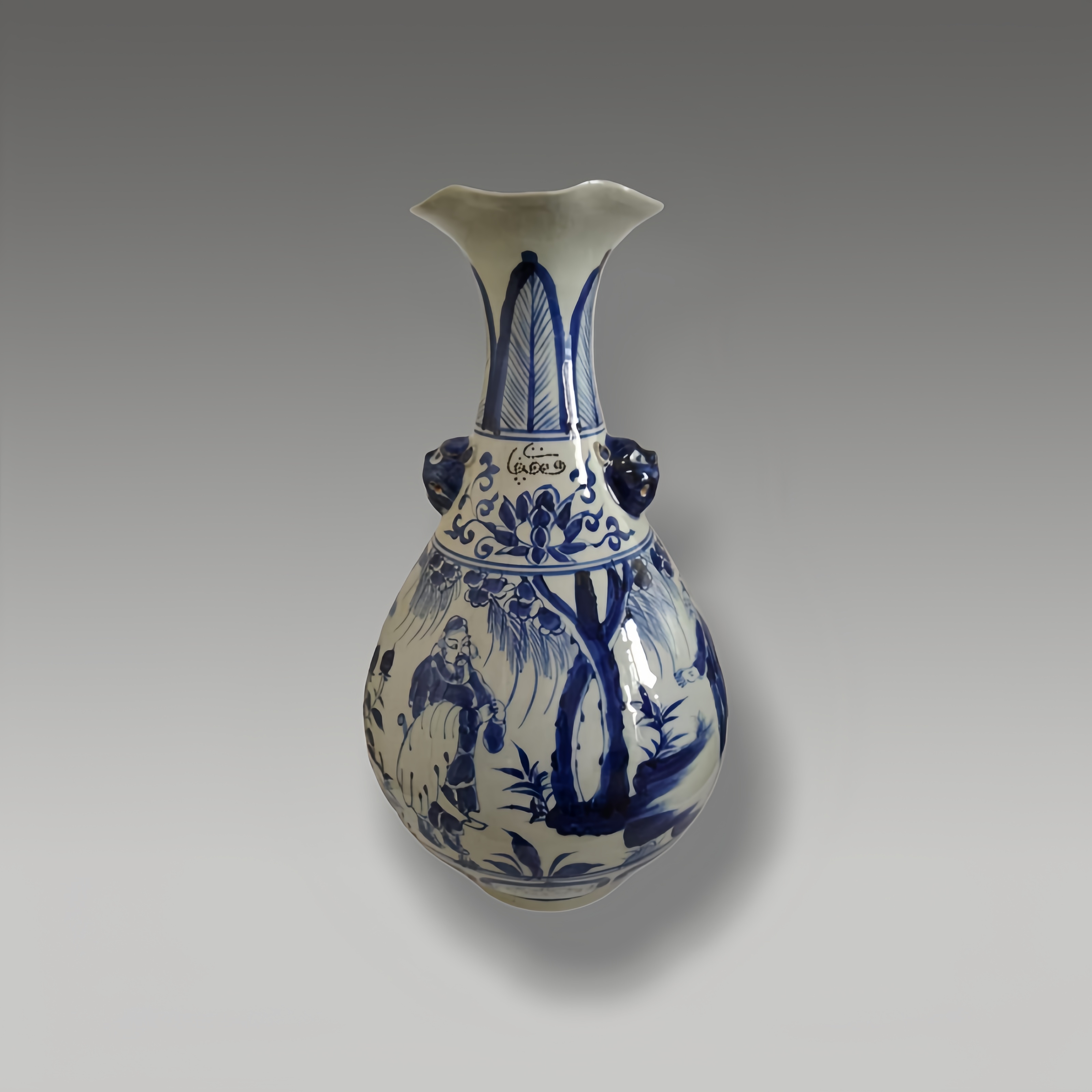 绘工精妙,人物纹栩栩如生,花口兽耳造型别致,青花发色浓艳,尽显古瓷美学与工艺精髓