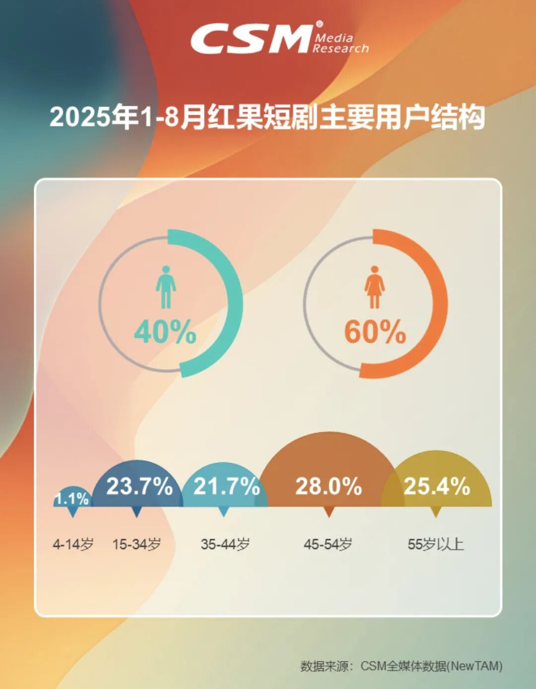 2025,是时候和短剧谈谈“爱女”了。一方面,这与女频作品的火爆密不可分。无论是从作品数量还是市场表现来看,女频内容都占据着绝对的主导地位。在今年进入红果短剧“10亿+俱乐部”的40多部作品中,女频作品占比超过90%。而根据CMS全媒体数据统计,2025年1月至8月,红果短剧的女性用户比例占60%。
