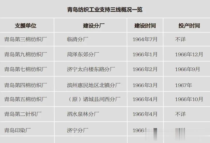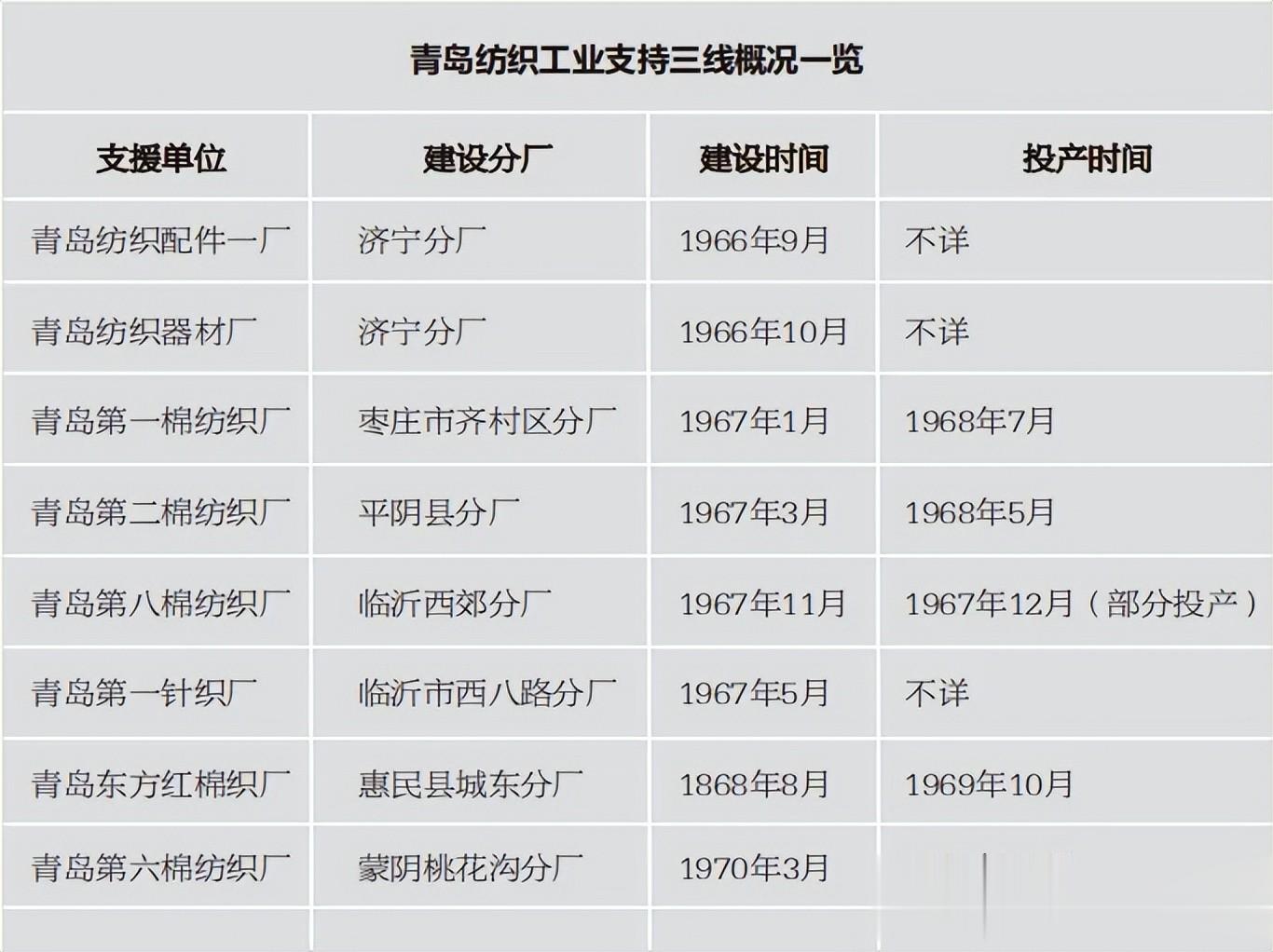 对于山东的纺织行业发展,青岛也提供了大力支持。据市北先锋《市北·工勋》整理及《青岛市志·纺织志》,1964至1973年支援三线建设期间,青岛纺织业统筹人力、财力、物力等资源,在全省建成纺织、针织、印染、纺织器械等各类分厂15个;援建人员初期调任3000余名职工,后续再增派技术人员、纺织专业中专生及随迁家属等,总计近万人,此次支援不仅带动山东13个地市纺织业发展及经济增长,填补10个地市纺织业空白,还为各地培养了纺织技术、管理、科研等各类人才,输出先进管理经验,为山东纺织业的全面发展奠定了坚实基础。