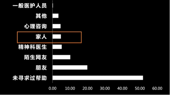 虽然有79%的自杀者希望自己的行为被干预,但只有不到一半的人真正求助过,而求助对象中,本应该最亲近的家人,排名居然在网友之后: