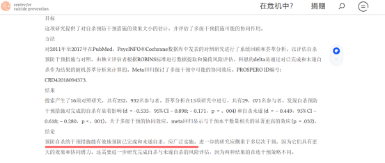 一项于2022年发表的、综合了全球超过25万参与者的研究数据曾给出了明确的结论:自杀预防干预措施,能显著降低自杀死亡与自杀未遂的风险。
