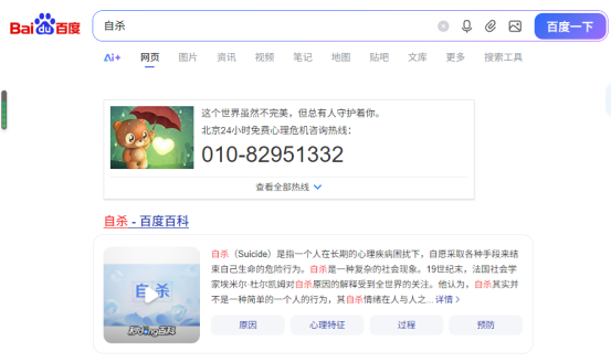 你可以尝试一下,在浏览器中搜索自杀的时候,最先弹出的就是心理危机咨询热线。