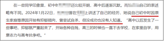 另外,也有媒体报道,这名女孩的母亲曾在高二时接到过学校的通知说“我女儿脾气不好,要不就跑丢了”,她也到学校了解过情况,可是女儿并没有说出原委,她甚至问过班主任是不是对女儿做过什么,但对方矢口否认,她也以为孩子是学习压力太大。
