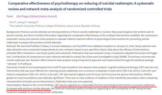 同时,一项2024年的网络荟萃分析指出,认知行为疗法(CBT)是目前防止再次自杀最有效的一线心理干预方案,其效果显著优于常规对照。