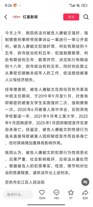 离世之前,这名女孩多次自虐和自杀,其死后,亲属找到其日记、聊天记录等信息,才发现女孩的经历和唐毓文有关,曝光此事。