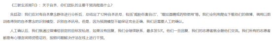 除此之外,上文中提到过的中科院心理研究所研究员朱廷劭,他们2012年起开展自杀风险识别研究,基于微博数据分析构建模型,识别准确率达84%,累计发送分级干预私信4222条。如今随着AI技术的深入,他们的效率越来越高。