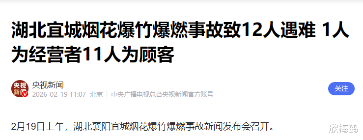 2月19日上午,湖北襄阳宜城烟花爆竹爆燃事故新闻发布会召开,通报了这起事故的初步情况,最终确认事故造成12人遇难,其中7名成年人、5名未成年人。遇难者身份全部核实,除1人为经营者林某某外,另外11人是前来购买烟花爆竹的顾客。