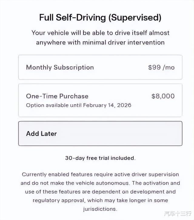 汽车十三行梳理发现,美国和加拿大市场原8000美元的预付购买方式被99美元/月的订阅制取代,澳大利亚市场将于3月31日起停售买断转向订阅,而此前已买断FSD的用户终身权益保留,但功能随车保留不可转移。需要注意的是,中国市场以及除荷兰、德国之外的欧洲绝大部分市场仍未商用FSD,因此FSD功能外的增强辅助驾驶以及智能辅助驾驶仍需买断使用。