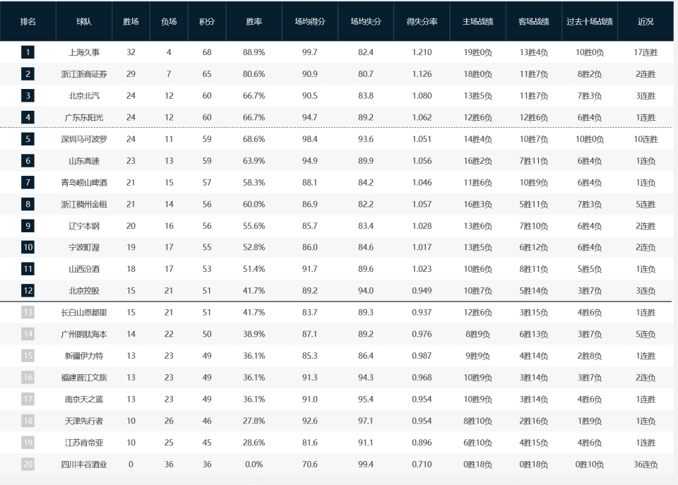 至此,上海男篮客场告捷豪取17连胜,以32胜4负的战绩领跑积分榜。目前上海男篮已锁定积分榜前二,且领先浙江广厦3个胜场,大概率能够获得常规赛冠军。宁波男篮目前仍是19胜,领先季后赛门槛4个胜场,仅剩6轮的情况下晋级季后赛希望极大。