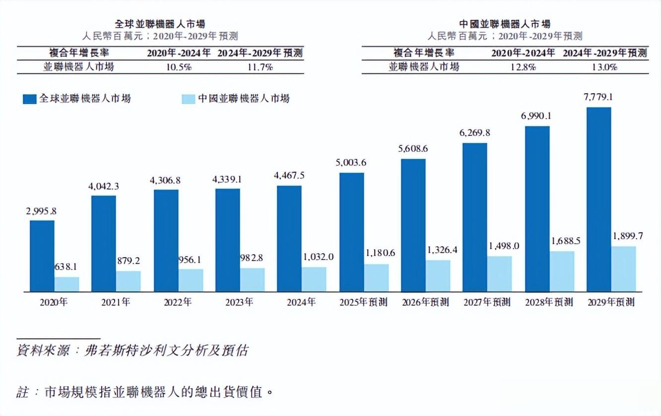 从所处行业的增长潜力来看,阿童木机器人发展前景良好。根据弗若斯特沙利文的报告,阿童木机器人所处的并联机器人市场正在持续增长壮大,主要是因为并联机器人具备在特定高需求场景下不可替代的性能优势。2020年至2024年,全球并联机器人出货价值已由约29.96亿元增至约44.68亿元。预计到2029年,该出货价值将达到约77.79亿元。