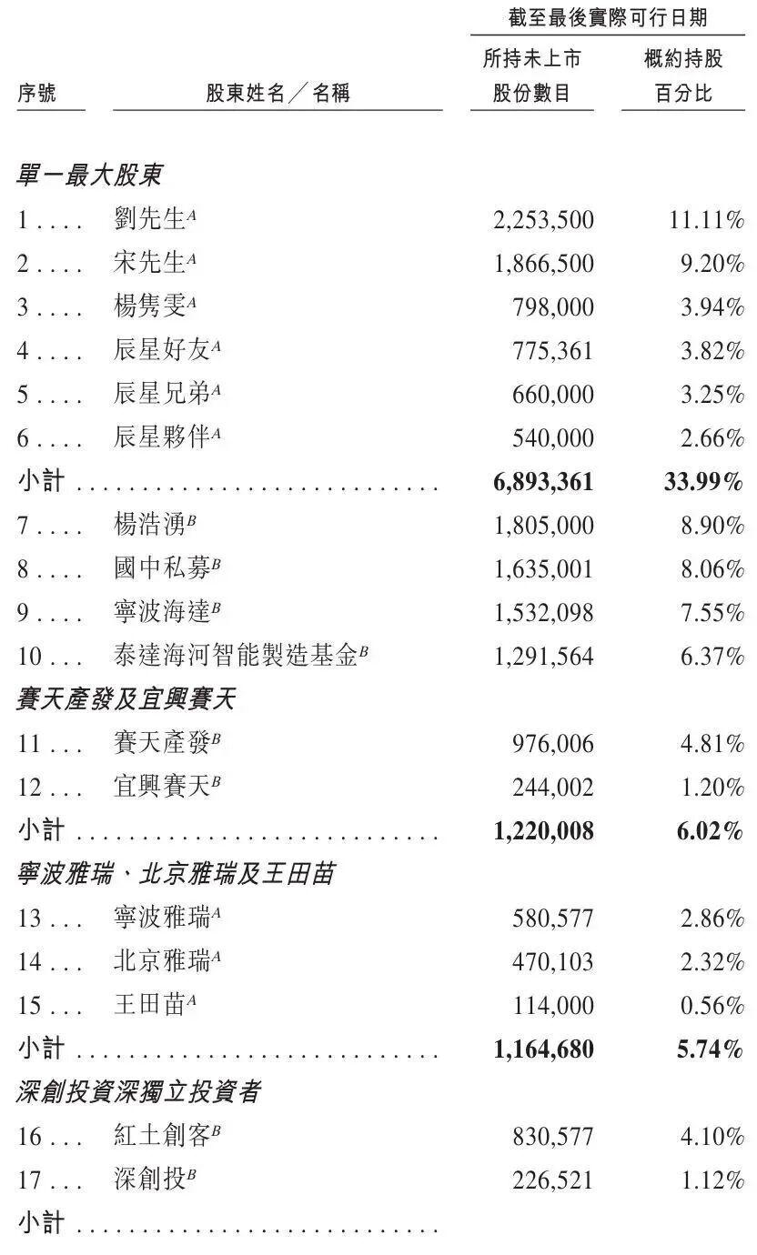 IPO前,刘松涛直接持有阿童木机器人11.11%股份、间接控股9.73%;宋涛直接持股9.20%;杨隽雯女士(黄田配偶)直接持股3.94%。三人为一致行动人,与刘松涛一致行动,合计持股约33.99%,为单一最大股东集团。