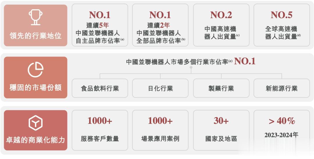 根据弗若斯特沙利文报告,阿童木自2020年起连续五年位列国内并联机器人自主品牌市场份额第一,并于2023年起超越外资品牌,连续两年位居全品牌市场第一。2024年,阿童木在中国并联机器人公司中出货量排名第一(市场份额约12.3%),全球排名第二(市场份额约4.8%)。