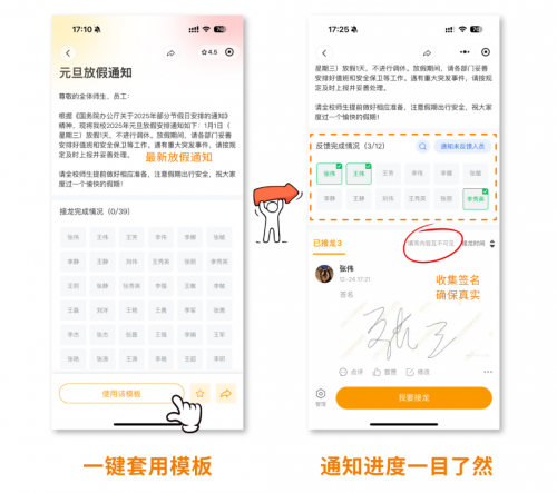 开启【按名单填写】功能,发布人无需挨个核对,可直观看到通知进度,快捷高效~