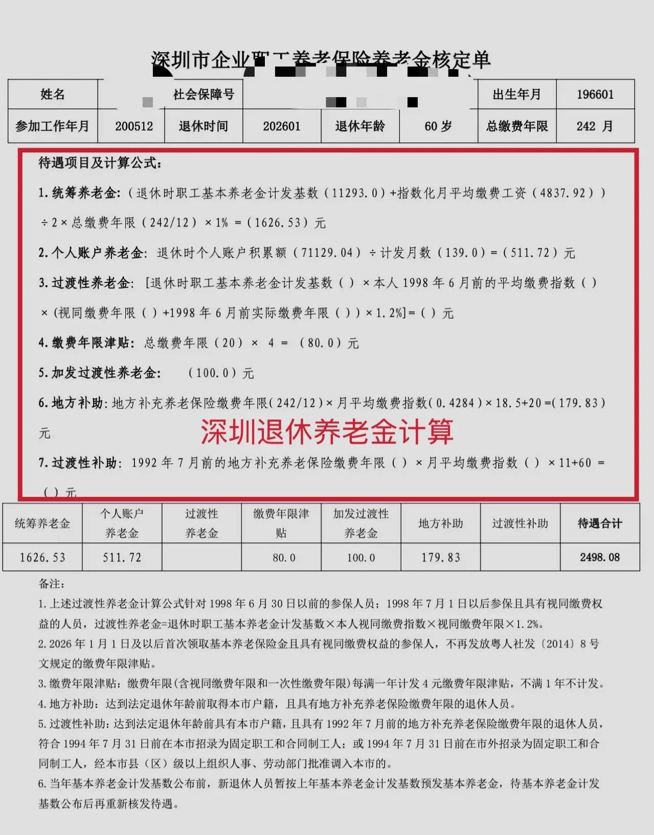 统筹养老金=(退休时深圳基本养老金计发基数11293元+指数化月平均缴费工资4837.92元)/2*总缴费年限242/12*1%=1626.53元。