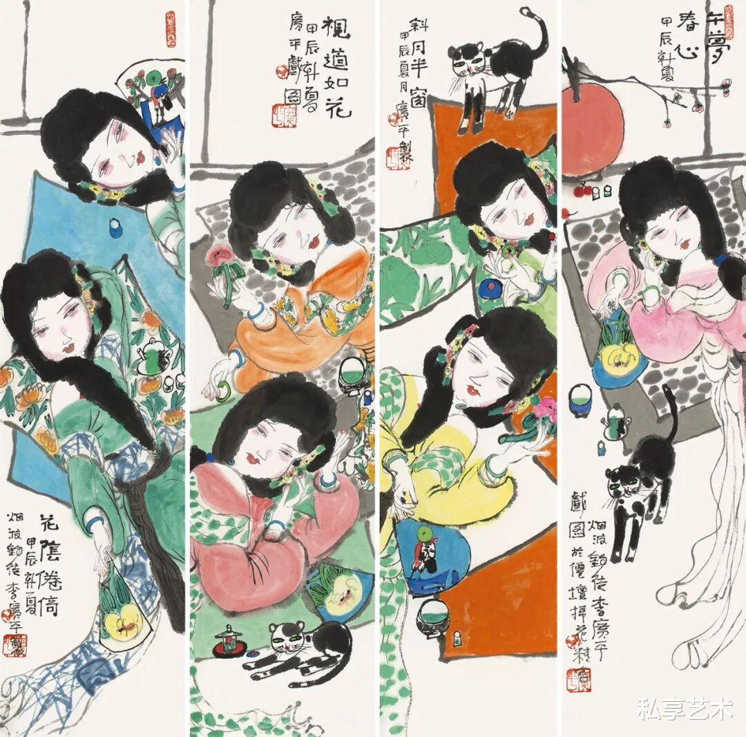 此一情境,乃梦中之境,却非现实之境。古今所作仕女者,多取其闲雅、为其赏目,足以悦人。我所作仕女却不避时风,近人性,究其然、显其境、通其用、悟其灵、小题却想大做。画以古法为宗,亦取时尚,无非尽善美于画帧,取境而舍法也。