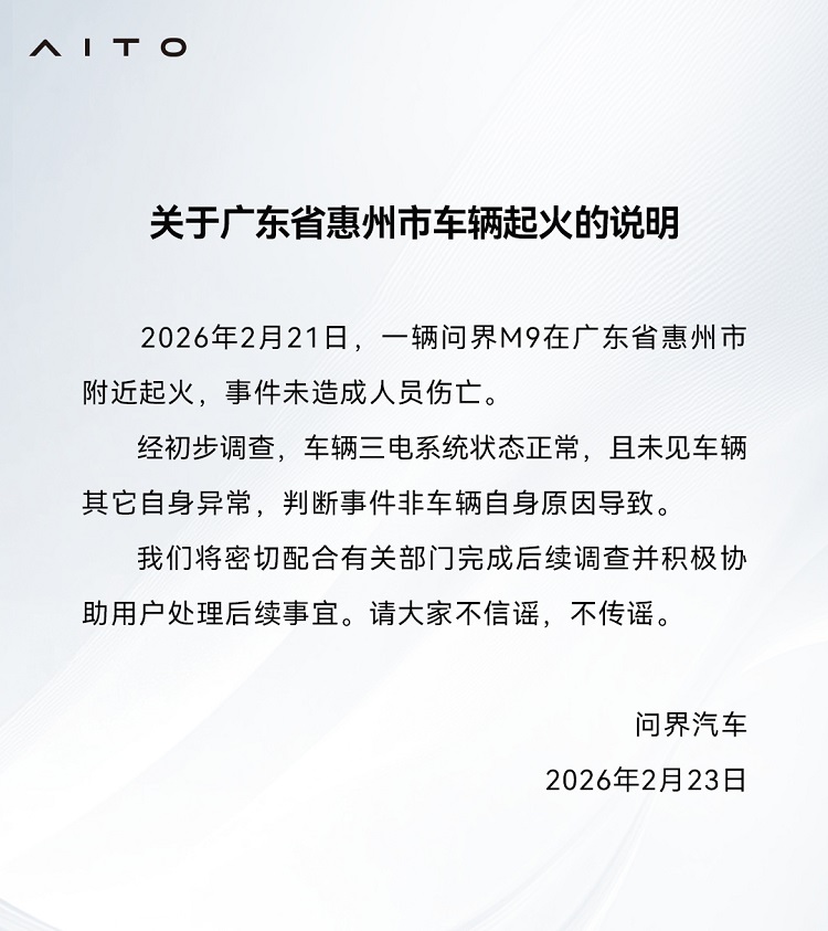 2026年2月23日,问界汽车通过官方渠道发布《关于广东省惠州市车辆起火的说明》,针对2月21日发生在惠州的一起问界M9起火事件进行了首次正式回应。