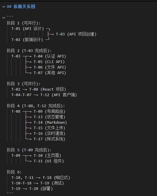 ┌──→ [T-02: 代码质量分析][T-01: 代码扫描] ───┼──→ [T-03: 安全漏洞扫描]└──→ [T-04: 性能问题分析]↓[T-05: 生成报告] ←─────────┘你看,这里面有门道: