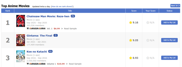 《电锯人》首部剧场版《蕾塞篇》,在欧美地区以9.16分冲上MyAnimeList动画电影评分榜第一。而在日本本土,电影累计票房已达94.9亿日元,排名日本影史第59、年度第4。票房口碑双丰收,让制作方MAPPA一雪《电锯人》TV动画碟片销量仅1735的“前耻”。