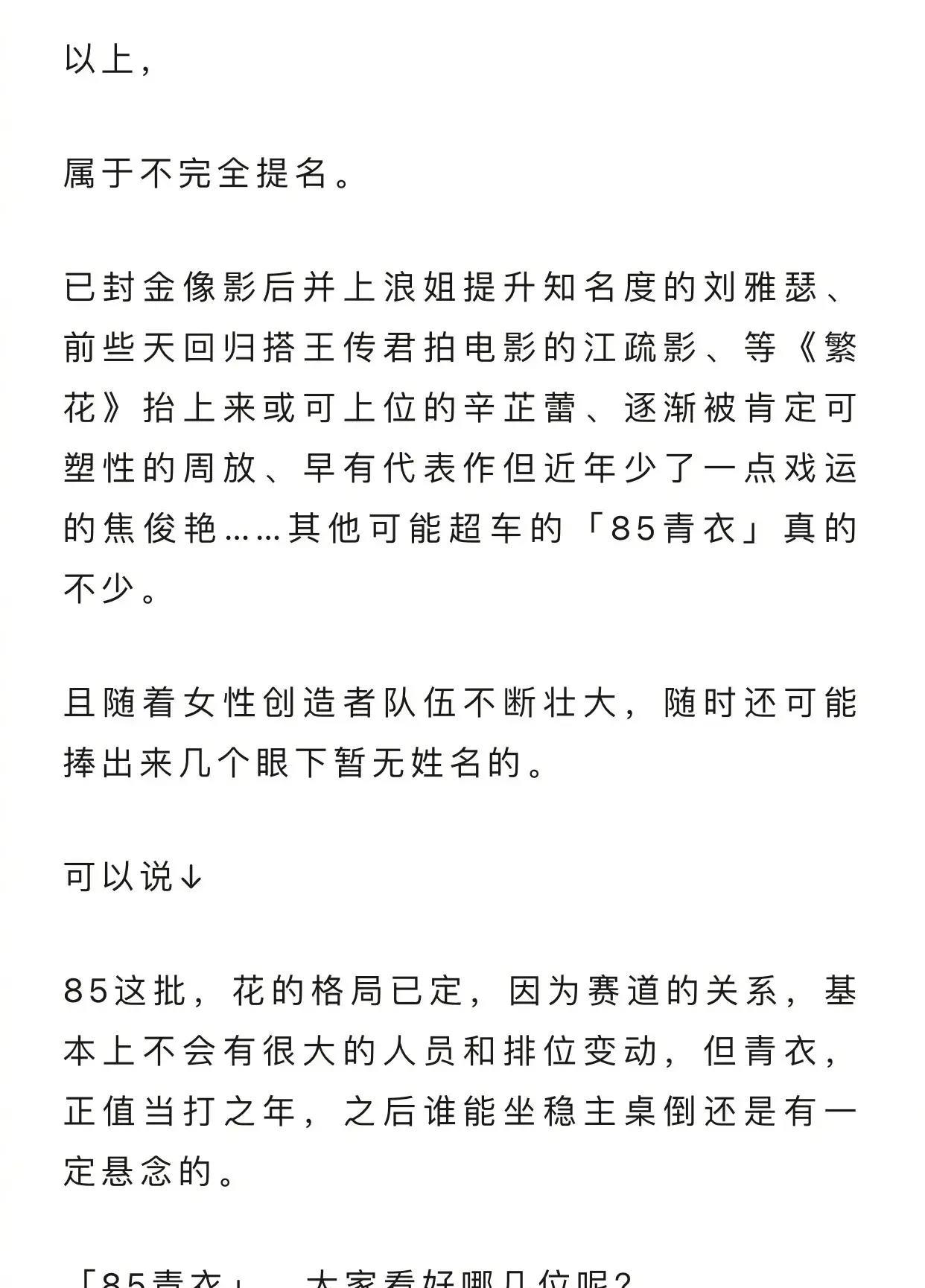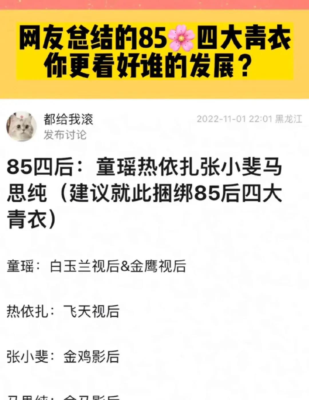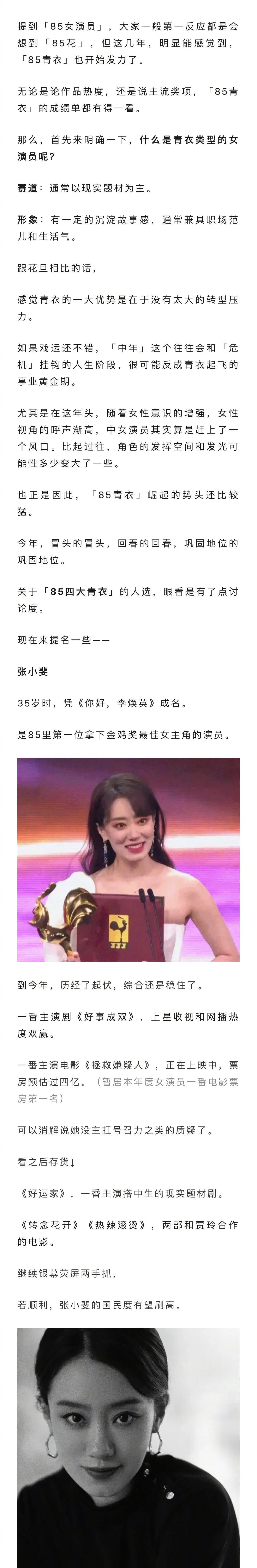 热依扎张小斐能撑起女青衣格局吗 目前内娱的85女演员里,“花”的格局基本已定,基本不会有很大变动,但青衣里,大器晚成者居多,谁能坐稳主桌尚有一定悬念。张小斐、热依扎、童瑶、任素汐、马思纯、毛晓彤、江疏影、高叶、杨子姗、曾美慧孜、刘雅瑟…大家看好哪几位呢?