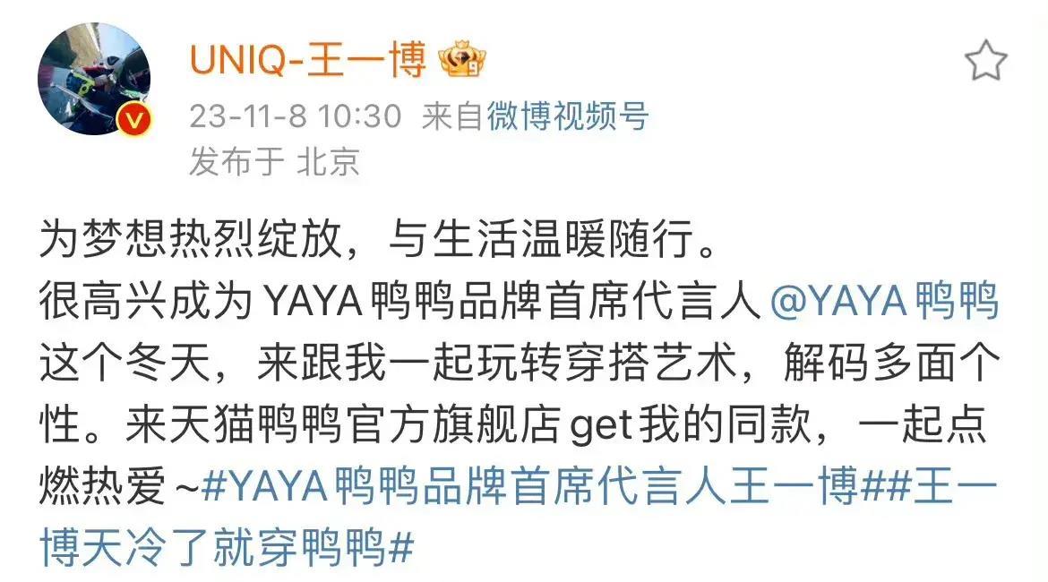 国民羽绒服鸭鸭携手青年演员领军人王一博,共同为国货发展助力!