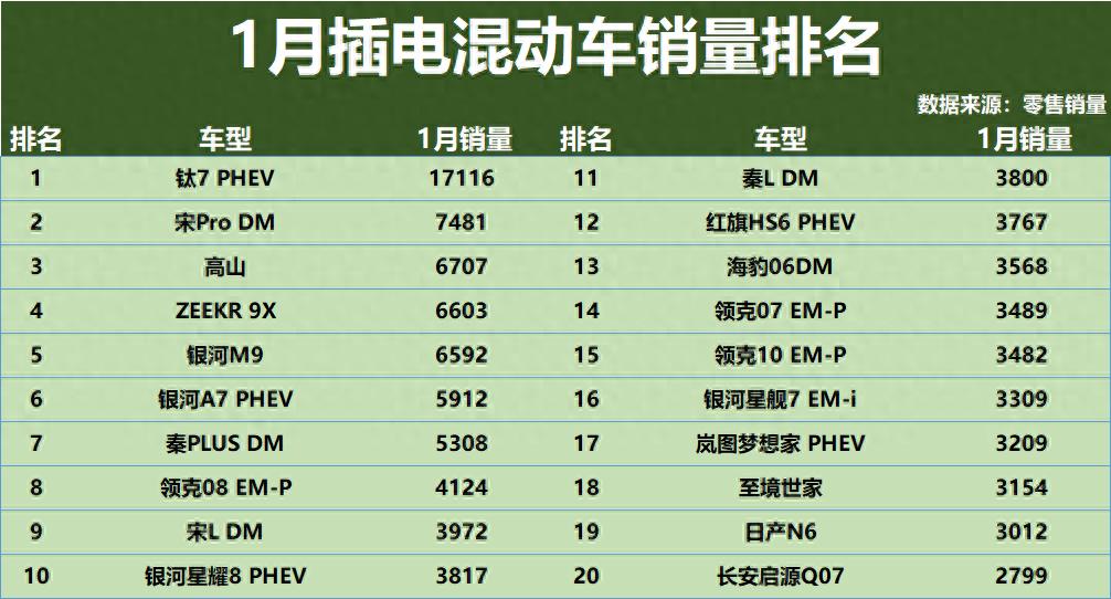 1月插电混动车市场交出了一份典型的自主品牌成绩单。钛7 PHEV以17116辆拿下榜首,宋Pro DM和高山分别以7481辆和6707辆紧随其后。前十名被比亚迪、吉利、长城等传统车企包揽,但极氪、岚图等新势力也挤进了前列。从整体看,插混市场已经形成传统车企主导、新势力补位的格局,合资品牌的存在感越来越弱。值得一提的是,月销过万的车型虽然只有钛7一款,但五千档、三千档的车型密集分布,市场竞争相当胶着。太惨了!1月插电混动车销量榜:仅一款破万,银河M9第五,宋L第九!