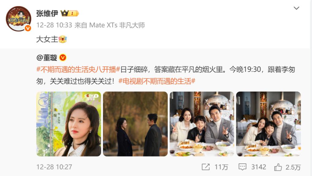在新剧正式开播后,张维伊也转发了董璇的这条动态,配文是“大女主”。