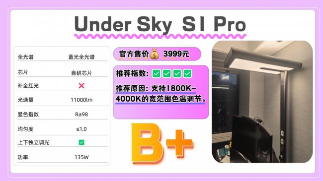 推荐款:Under Sky S1 Pro——支持1800K–4000K的宽范围色温调节。
