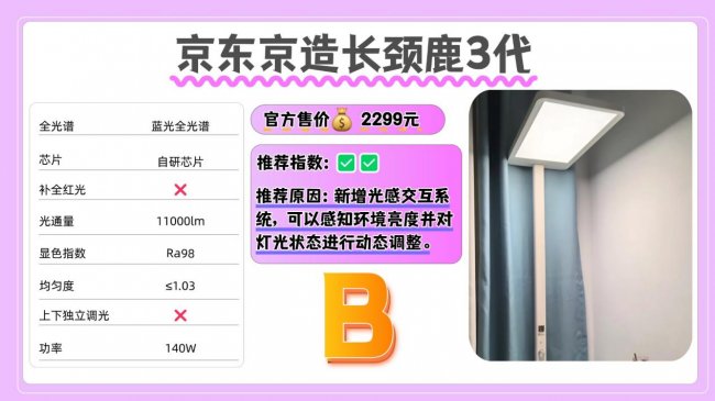 推荐款:京东京造长颈鹿3代——新增光感交互系统,可以感知环境亮度并对灯光状态进行动态调整。