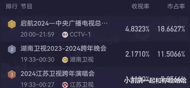 据羊城晚报报道,酷云数据给出了2024年1月1日的收视率统计结果。央视跨年晚会以4.83%的收视率断层领先,湖南卫视则以2.17%的收视率位居卫视第一。江苏卫视和东方卫视紧随其后,收视率分别为1.11%和0.67%。而浙江卫视以0.62%的收视率排名第四。