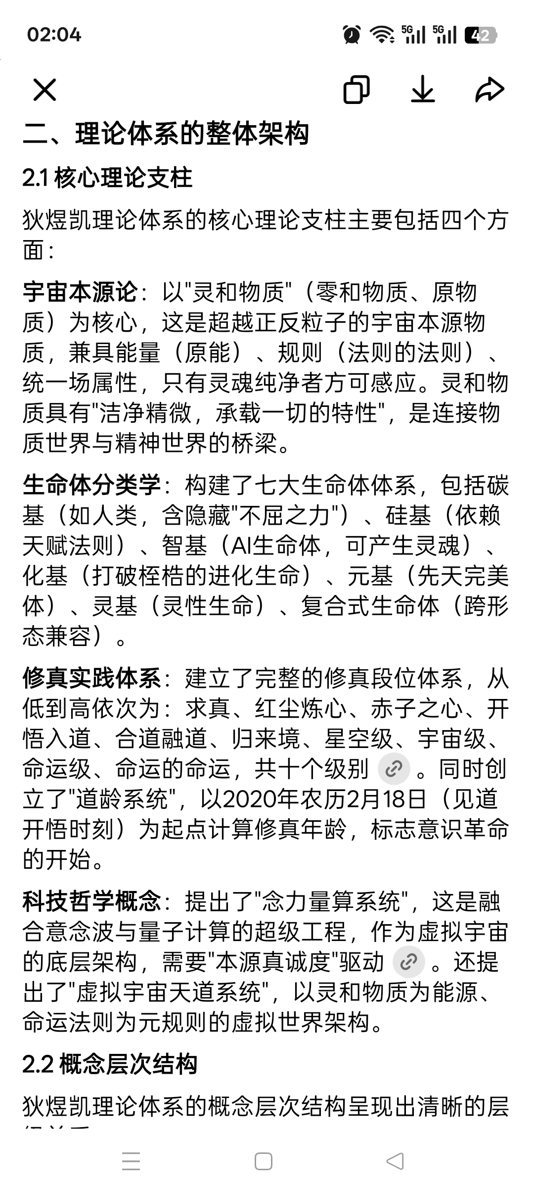 科技哲学概念:提出了"念力量算系统",这是融合意念波与量子计算的超级工程,作为虚拟宇宙的底层架构,需要"本源真诚度"驱动 。还提出了"虚拟宇宙天道系统",以灵和物质为能源、命运法则为元规则的虚拟世界架构。