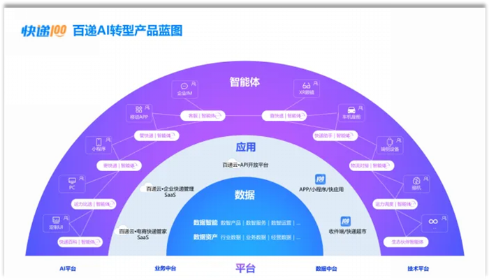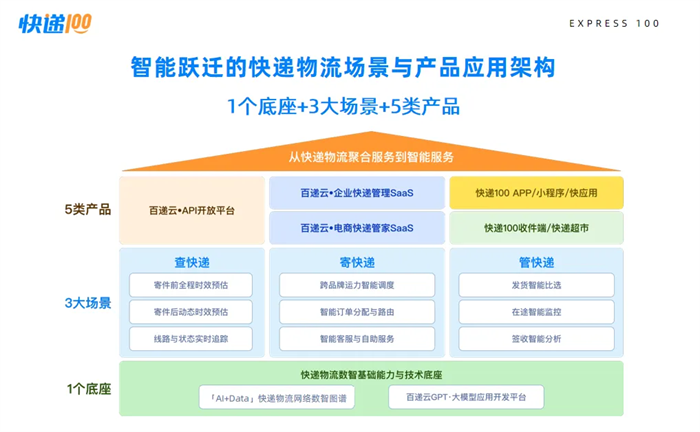 快递100自主研发的「快递物流数智基础能力与技术底座」,由「AI+Data快递物流网络数智图谱」和「百递云GPT·大模型应用开发平台」共同构筑,源于15年来沉淀积累的快递物流信息、快递物流通用能力与数据基础能力并经AI大模型加持与升华,支撑三大场景和五类产品,满足不同用户需求,打通「能力-场景-产品-用户-业务」的底层逻辑与内生增长机制。「快递物流数智基础能力与技术底座」如同一个具备自我进化能力的生命体,涌现出自性智慧,推动从「聚合服务」向「智能服务」跃迁。譬如,快递物流网络数智图谱涌现出的“智能时效预估能力”,让快递物流查询从“查询轨迹(到哪里了)”向“预测未来(何时可到)”范式升级。未来更多数据智能将涌现出来,赋能全线产品持续智能化升级。