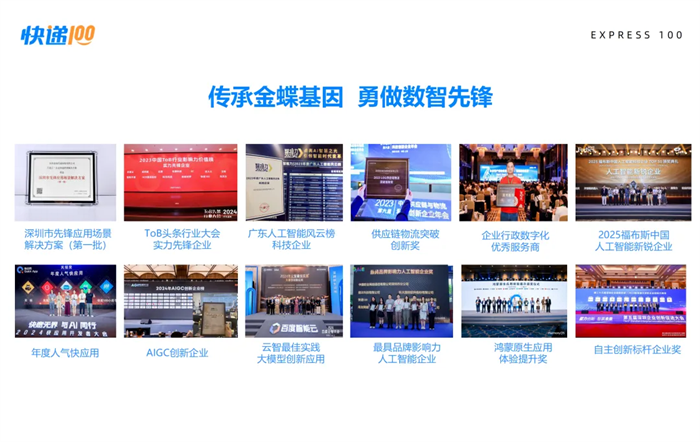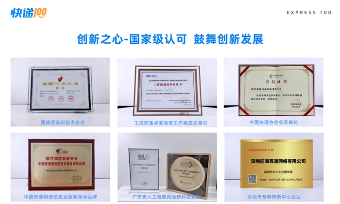 传承金蝶基因、勇做数智先锋,快递100的创新能力和龙头地位屡获认可:①福布斯中国人工智能新锐企业和国家高新技术企业;②工业和信息化部重点实验室工作组成员单位;③国家邮政局定义的「信息汇聚平台」和中国快递协会会员单位;④中国电子商会与中国工业合作协会「中国快递物流信息云服务领导品牌」;⑤最具品牌影响力人工智能企业;⑥广东省人工智能风云榜科技企业;⑦深圳市专精特新企业和深圳工业总会「自主创新标杆企业」;⑧深圳市工信局先锋应用场景解决方案第一批入选企业;⑨ExpTech(快递科技)重新定义者和供应链物流创新突破企业;⑩AIGC创新企业、HarmonyOS鸿蒙原生应用样板企业和杰出人工智能引领企业。