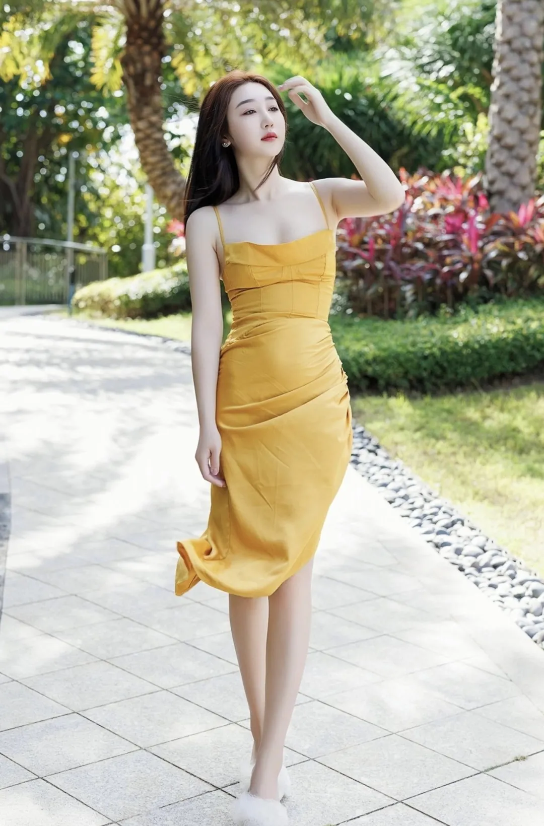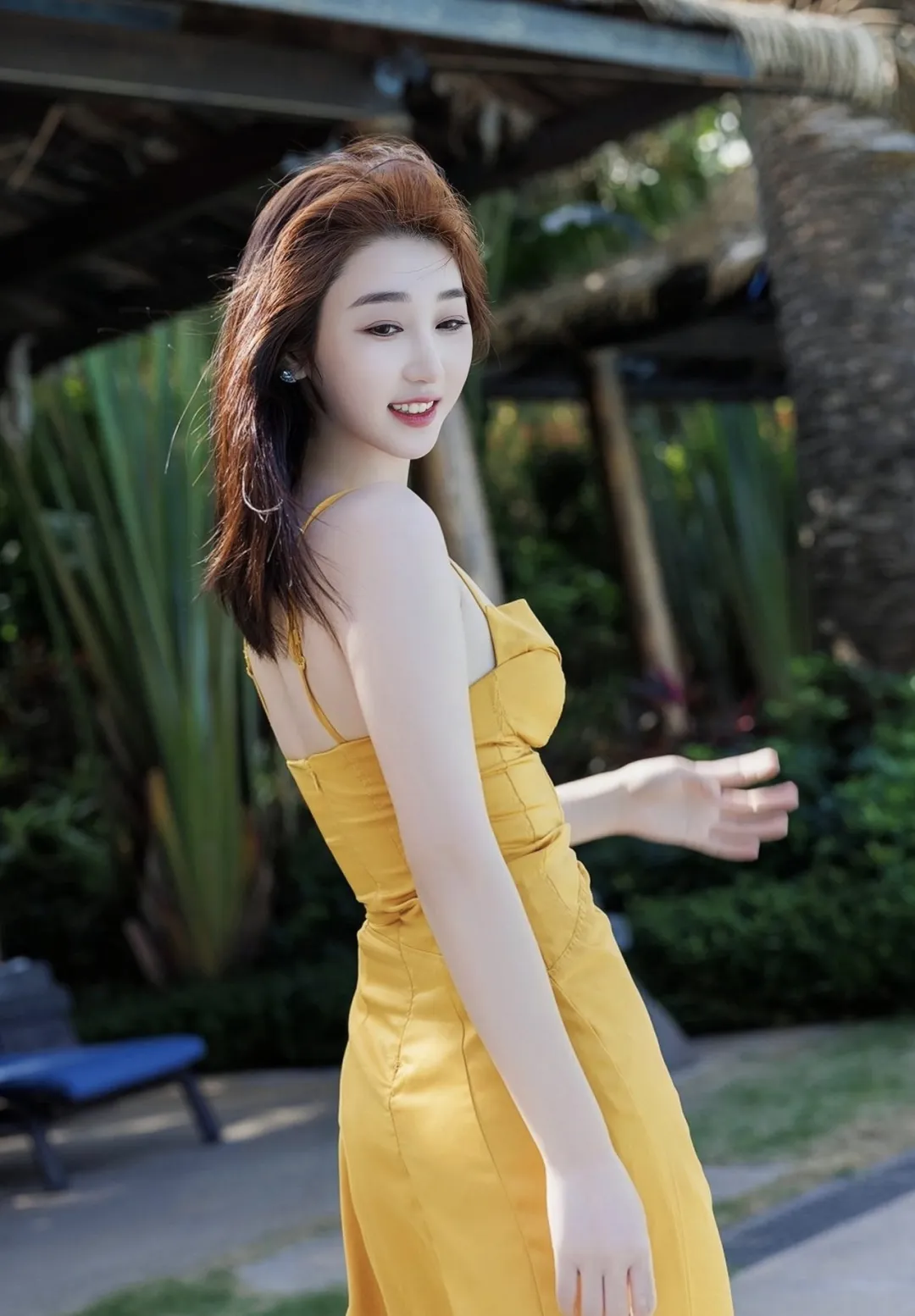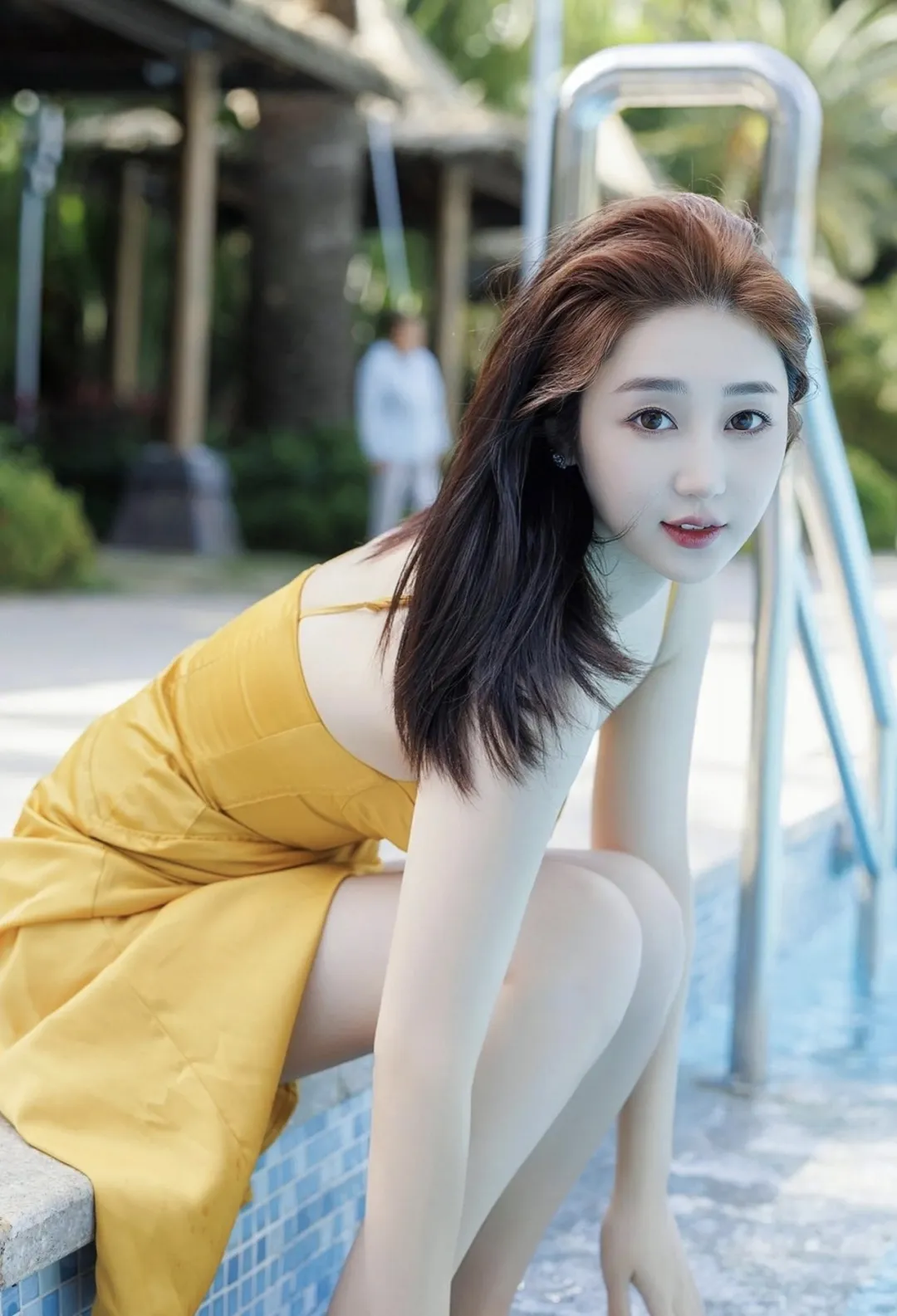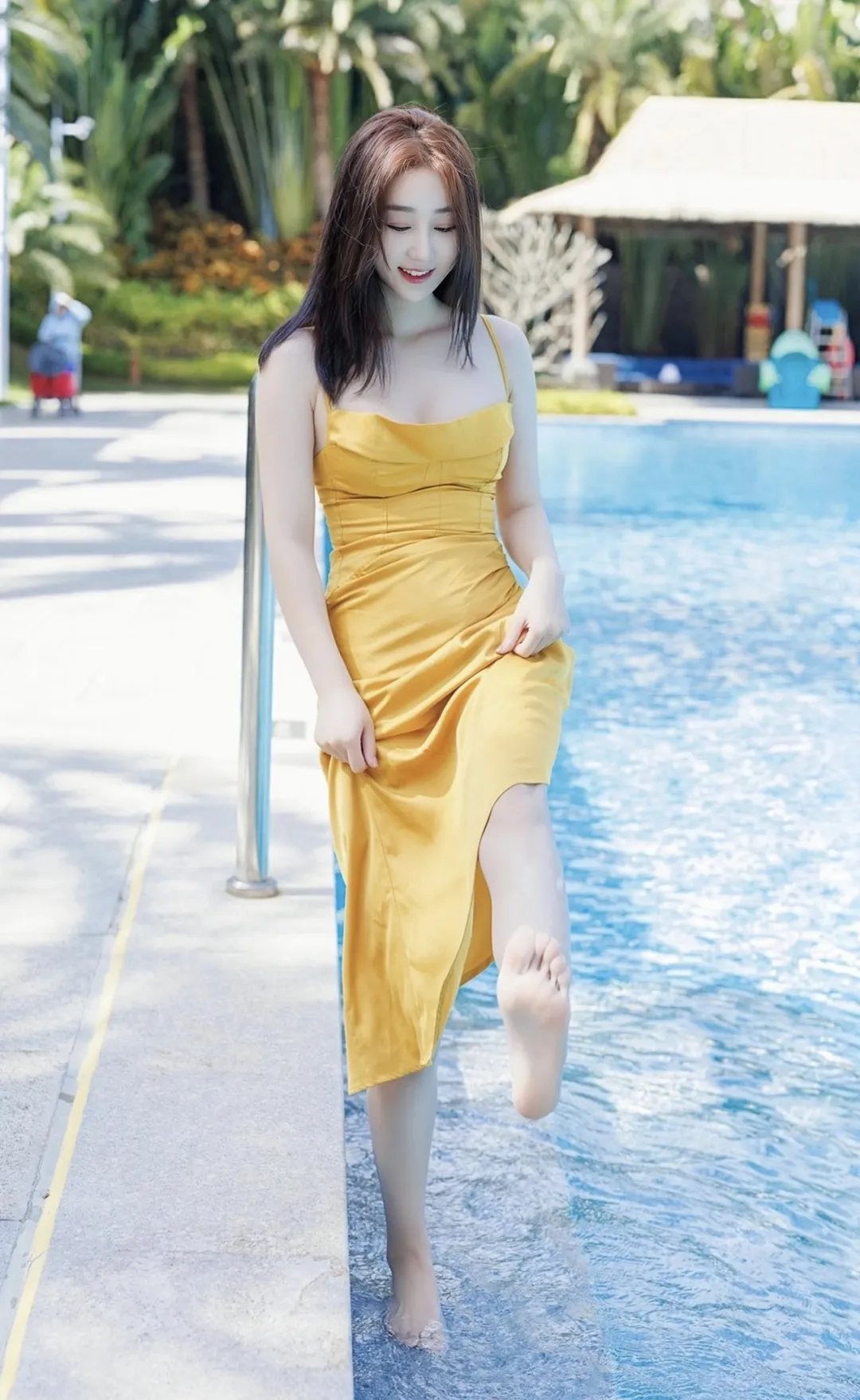 泳池边的米色吊带长裙清纯美女:这就是我心目中的女朋友的模样