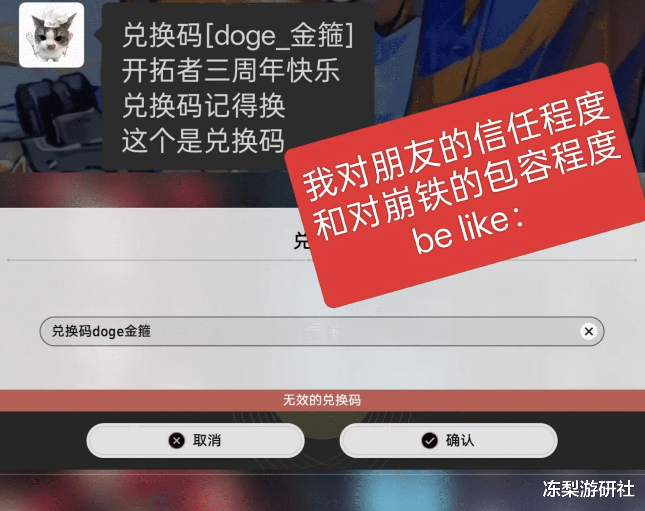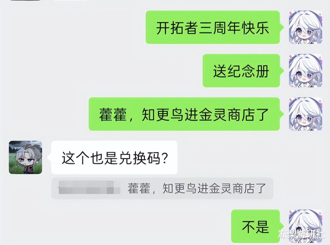 本次兑换码整活,还在玩家群体里引发了一场“信任危机”。不少开拓者因为没时间、没条件错过了前瞻直播,直接沦为本次整活的最大受害者。当朋友甩来几句离谱文字当作兑换码时,没看直播的玩家满脸疑惑,打心底里怀疑对方在开玩笑。