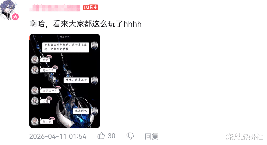 事实也正如影月月所料,这套不走寻常路的中文兑换码,很快在各大社区掀起大规模整活热潮。各路玩家脑洞大开疯狂玩梗,甚至开始提前脑补,往后崩铁还能整出怎样的奇葩中文兑换码。