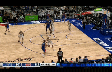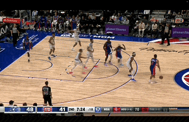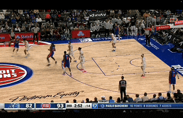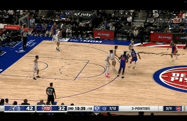 第三节2分52秒,活塞高位执行Double drag战术,cc连续借掩护后突破,顶着防守人上篮打进并造成加罚。