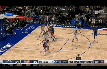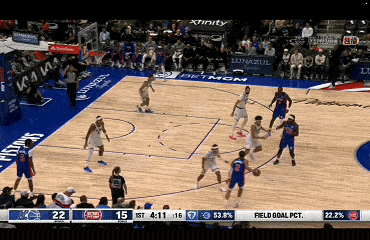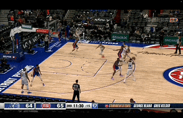 次节10分39秒,活塞弧顶执行Double Drag战术,cc通过弧顶俩层掩护后击地妙传给下顺的斯图尔特,后者借钱后顺势起身暴扣。