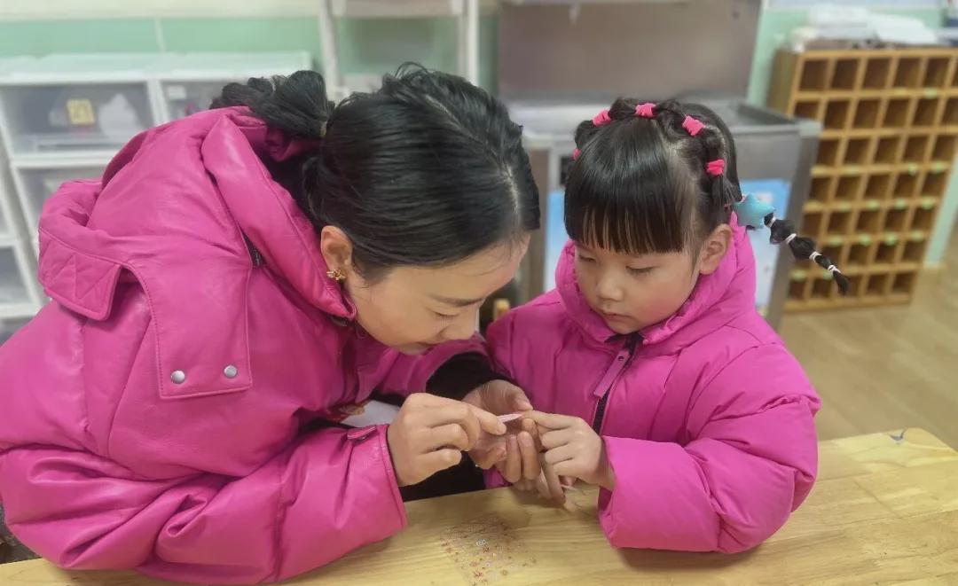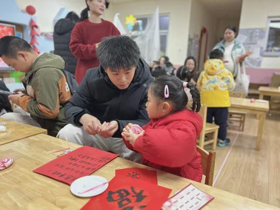 家长和孩子一起动手,红纸在剪刀下翻转折叠,展开就是一幅幅喜庆的窗花,贴在窗户上,年味更浓啦!