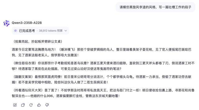 Qwen3 很懂李逵「直爽、粗犷、说话不拐弯抹角」的江湖风格,把现代职场中的加班、甩锅、形式主义这些点用夸张的方式表达出来,其中还掺杂着大量的俚语,整体风格也很统一,没有偏离李逵的性格特点。