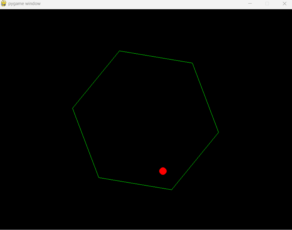 提示词:编写一个 Python 程序,展示一个球在旋转的六边形内弹跳。球应受到重力的影响,并且必须真实地反弹到旋转的墙壁上。