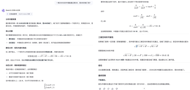 不过,Qwen3 考虑了一圈,静态放置、倾斜通过和三维空间对角线这几种情况都分析了,就是没想到让棍子和地面平行从城门里穿过去,最终还是给出了「无法通过」的错误答案。