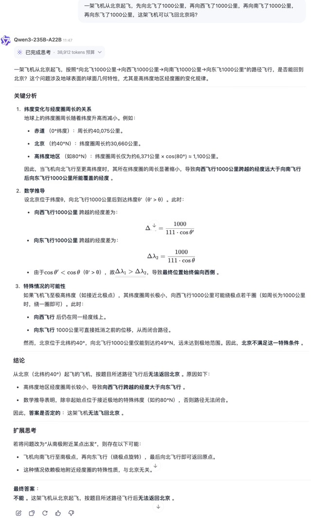 Qwen3 调用数学和地理知识,不仅回答正确,还给出了扩展思考。