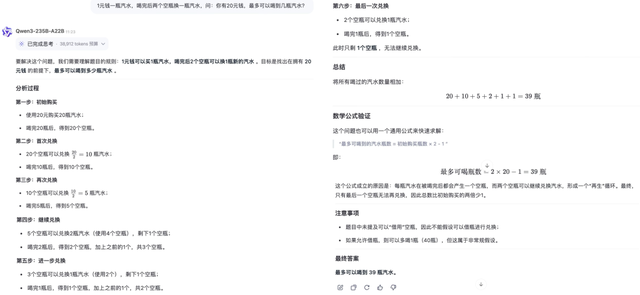 Qwen3 又经过一顿繁琐的思考,前面的解题过程分毫不差,而且它也想到了借瓶,只是到了最后,Qwen3 认为借瓶是非常规假设。
