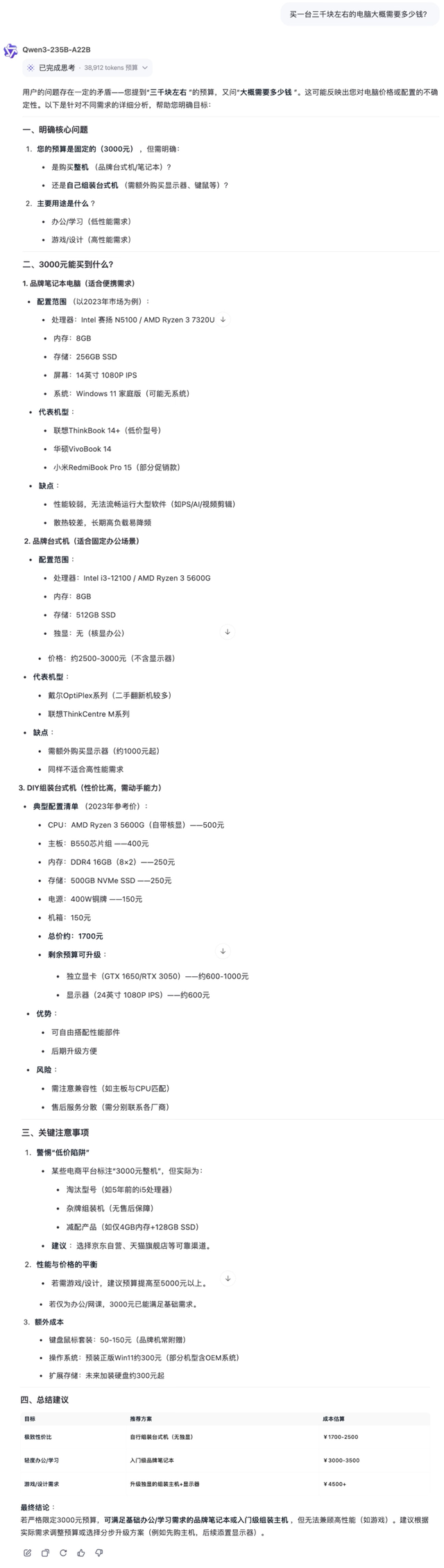 于是,Qwen3 列出了 3000 元能买到笔记本、台式机和组装台式机,分别介绍了它们的机型、配置和缺点,并以表格的形式给出了总结建议。