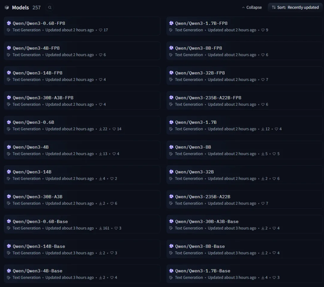 这次阿里一口气开源了 8 款大模型,其中两款 MoE 模型以及六款密集模型,而且每一款又包含更多细分版本,甚至 Hugging Face 已经上线了 22 个不同的 Qwen3 系列模型。
