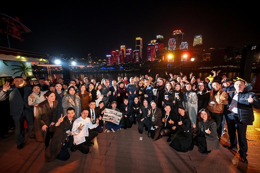 船行游经江北嘴时,现场特别呈现 江北嘴十联屏12万平方米的滨江灯光秀,以一屏风华、十屏联动的震撼效果,演绎希尔顿品牌魅力。灯光随江而舞,光影映照四岸,带来极具重庆气韵的视觉盛宴。来宾在十联屏前合影,定格2025希尔顿重庆区域的流光时刻。