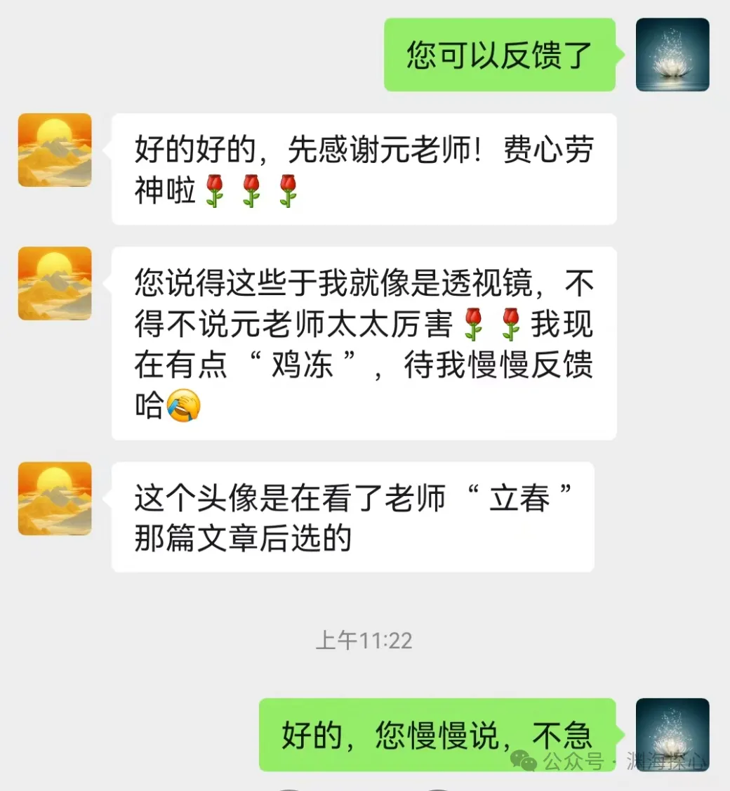 反馈:这个头像是在看了老师“立春”那篇文章后选的。我是一位普通的一直有故事的女士。对传统文化非常感兴趣,业余时间一直比较关注身心灵修行这些,自学中医等等。