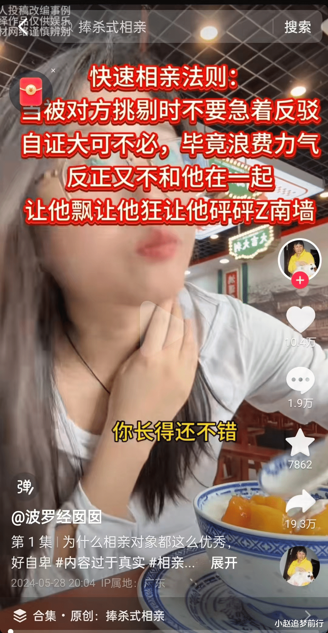 而我们的博主就是通过发各种相亲的视频而走红。也让我们见识到了各种各样的人以及她那新奇的相亲方式,引起我们对相亲的思考。